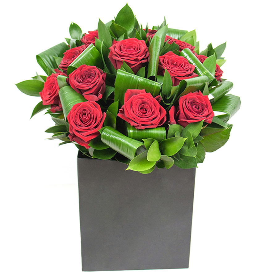 Celebrate elegance with our classic bouquet featuring red roses, enriched with aspidistra leaves and ruscus, designed to impress and delight.