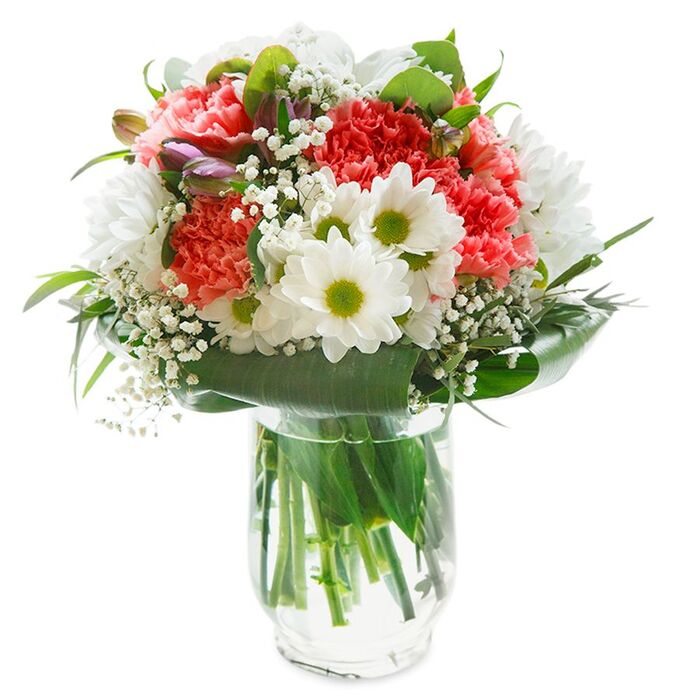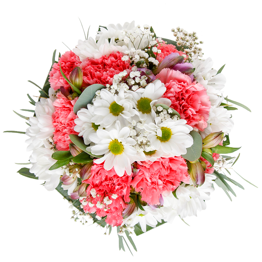 Celebrate harmony with our Blossoming White & Pink Harmony Bouquet. This exquisite arrangement features a blend of snow-white chrysanthemums, delicate gypsophila, soft light pink carnations, and lush aspidistra leaves, thoughtfully designed to create a balanced and stunning display.